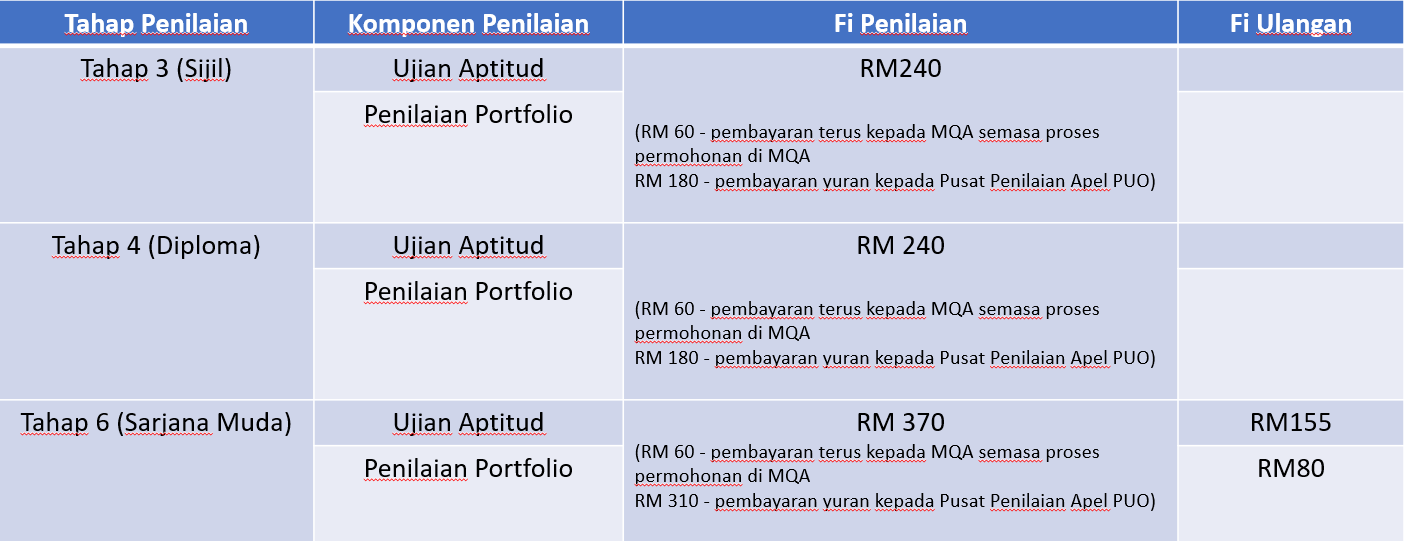 *Fi Penilaian (tidak termasuk proses rayuan dan ulangan semula – jika berkaitan). Caj penilaian APEL perlu dibuat kepada Pusat Penilaian APEL (PPA) yang dipilih oleh pemohon